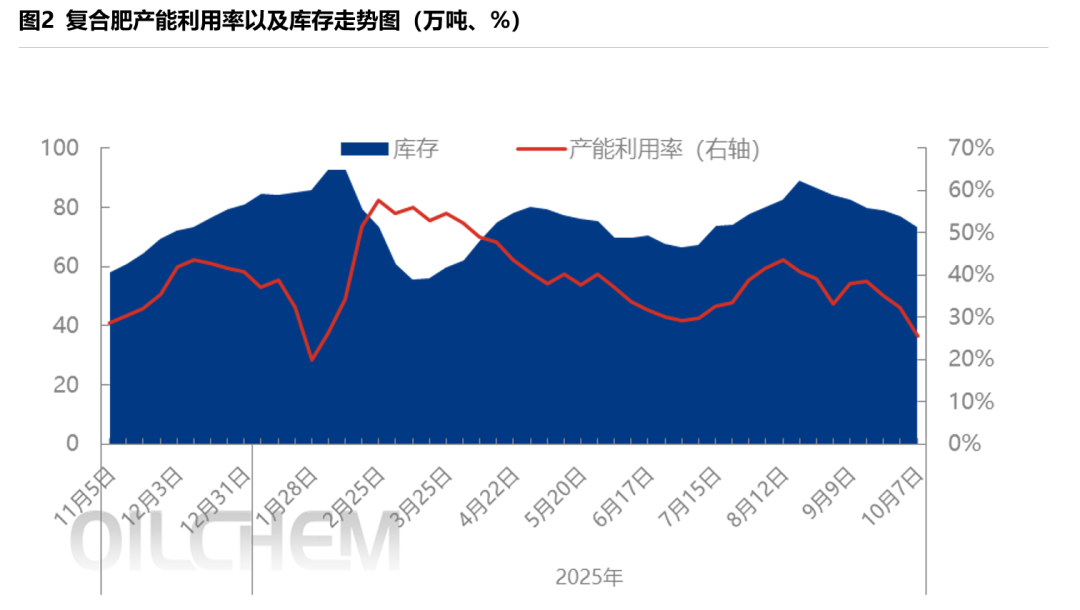9月中下旬,伴随季节需求转弱,复合肥产能利用率开始下降,节日期间主产区如山东、河南、河北、湖北等地部分装置停车检修增多,造成开工率大幅走低,截至目前降至25.5%。究其原因,一方面是刚需不足,企业新接订单量有限;一方面是持续降雨天气导致基层用肥延后,发运受限。
