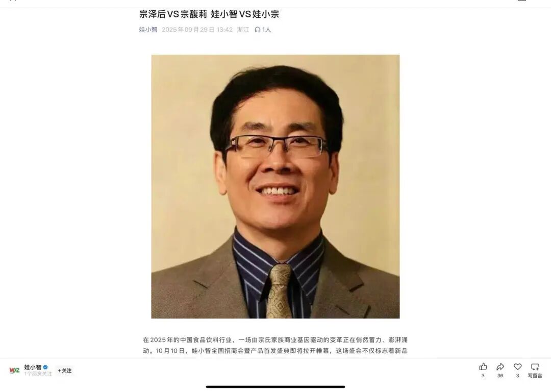 在这篇9月29日发布的《宗泽后VS宗馥莉 娃小智VS娃小宗》微信推文中,写道:2025年9月,一份《关于开展2026销售年度经销商沟通工作的通知》流出,显示娃哈哈集团决定从2026年起更换使用新品牌“娃小宗”,以维护品牌合规性。与之形成鲜明对比的是,宗泽后与吴坚为“娃小智”所设定的赛道,并非对传统业务的简单修补或延伸,而是以新消费为根本基因,从品牌内核、产品创新到市场推广进行系统性重构。