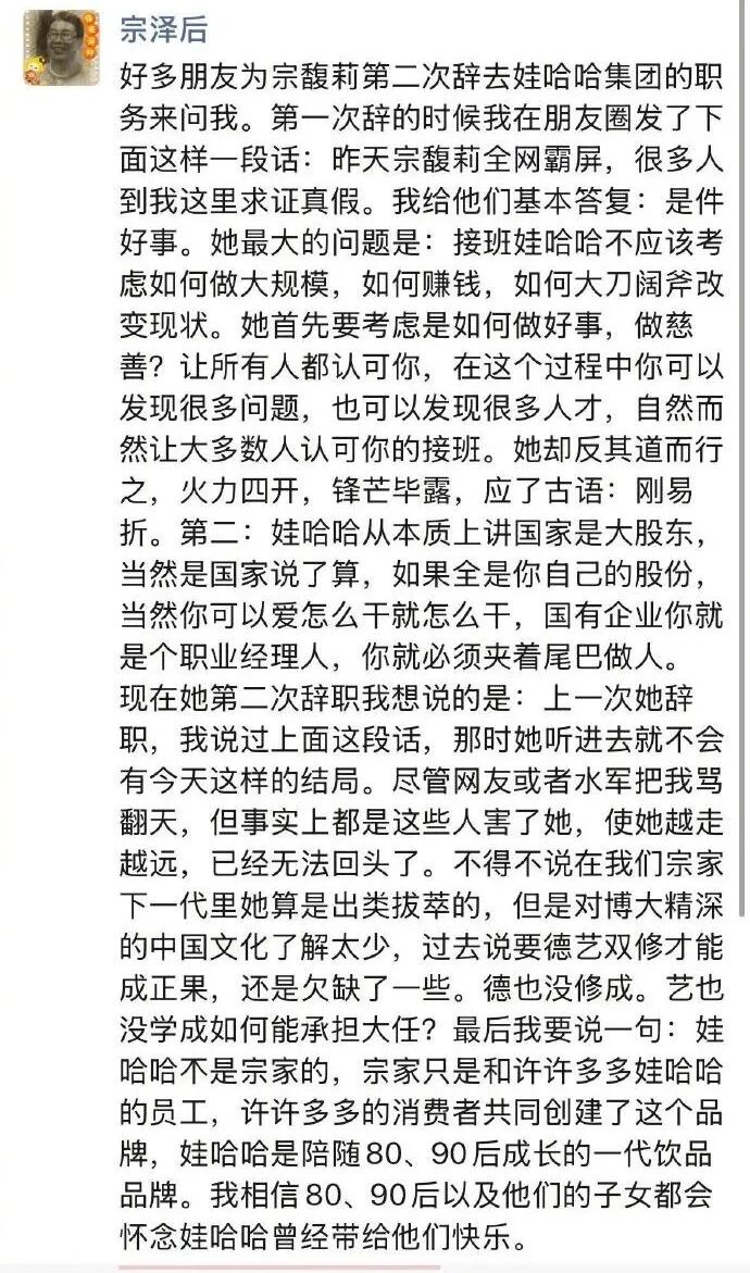 宗泽后还写道:“不得不说在我们宗家下一代里她算是出类拔萃的,但是对博大精深的中国文化了解太少,过去说要德艺双修才能成正果,还是欠缺了一些。德也没修成。艺也没学成如何能承担大任?最后我要说一句:娃哈哈不是宗家的,宗家只是和许许多多娃哈哈的员工,许许多多的消费者共同创建了这个品牌,娃哈哈是陪随80、90后成长的一代饮品品牌。我相信80、90后以及他们的子女都会怀念娃哈哈曾经带给他们快乐。”