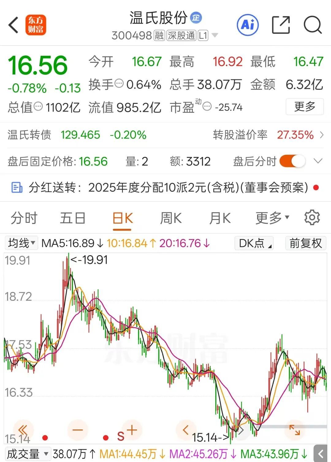 4月21日,温氏股份股价下跌0.78%,收报16.56元,总市值为1102亿元。