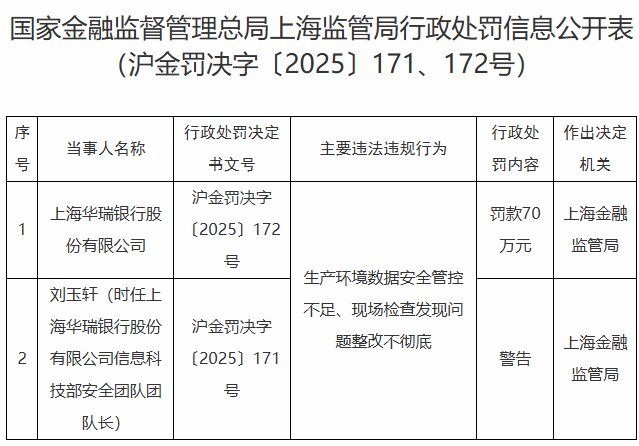 ]article_adlist-->根据国家金融监督管理总局上海监管局于10月11日公布的行政处罚信息,上海华瑞银行股份有限公司因生产环境数据安全管控不足、现场检查发现问题整改不彻底被处以70万元罚款。